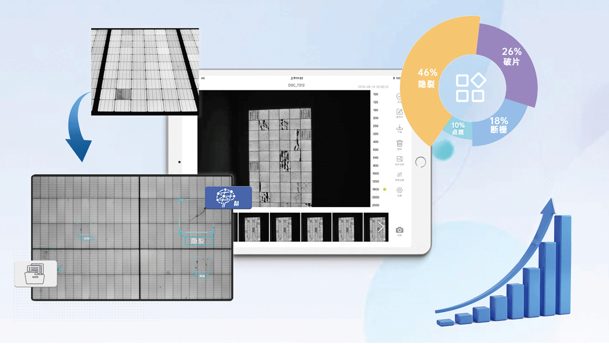 檢測(cè)軟件:平板電腦APP、軟件遠(yuǎn)程操控相機(jī)檢測(cè)拍照,軟件操控EL電源同步檢測(cè)上電;EL視頻檢測(cè)預(yù)覽;EL識(shí)別標(biāo)記分類;Ai圖像隱裂自動(dòng)識(shí)別標(biāo)記;檢測(cè)報(bào)告自動(dòng)生成;檢測(cè)組件定位建模;