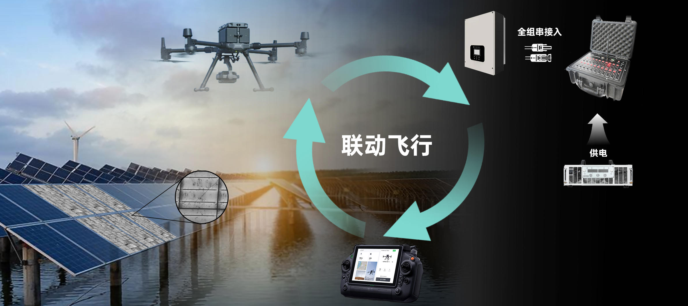 針對光伏電站EL上電特性,定制開發(fā)可同步控制1~20路組串自動切換上電模塊,實現(xiàn)真正意義上的無人化自動巡檢,可在匯流箱/逆變器處控制全部組串,實現(xiàn)200米范圍的無線通訊自動上電并聯(lián)動無人機航線拍攝。