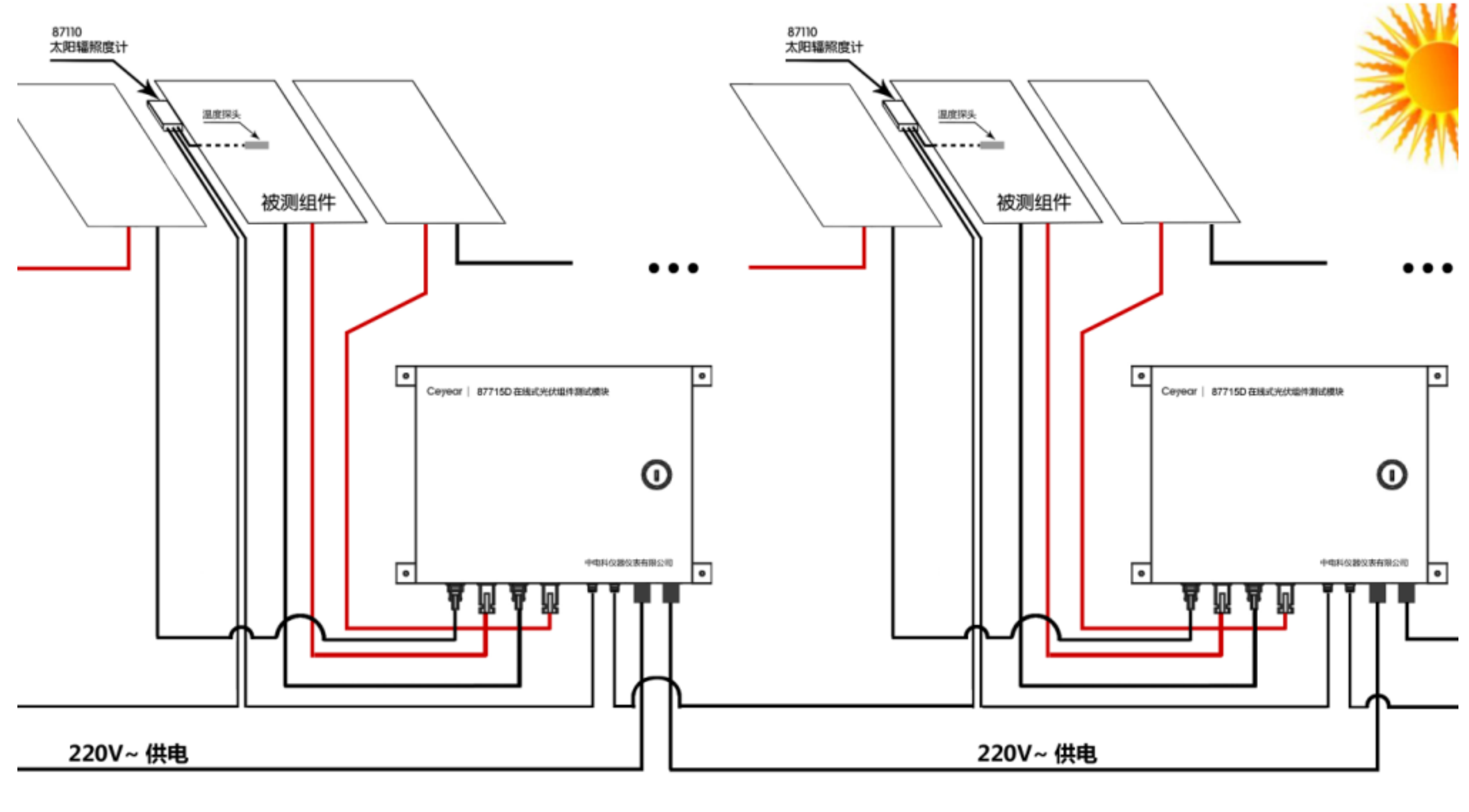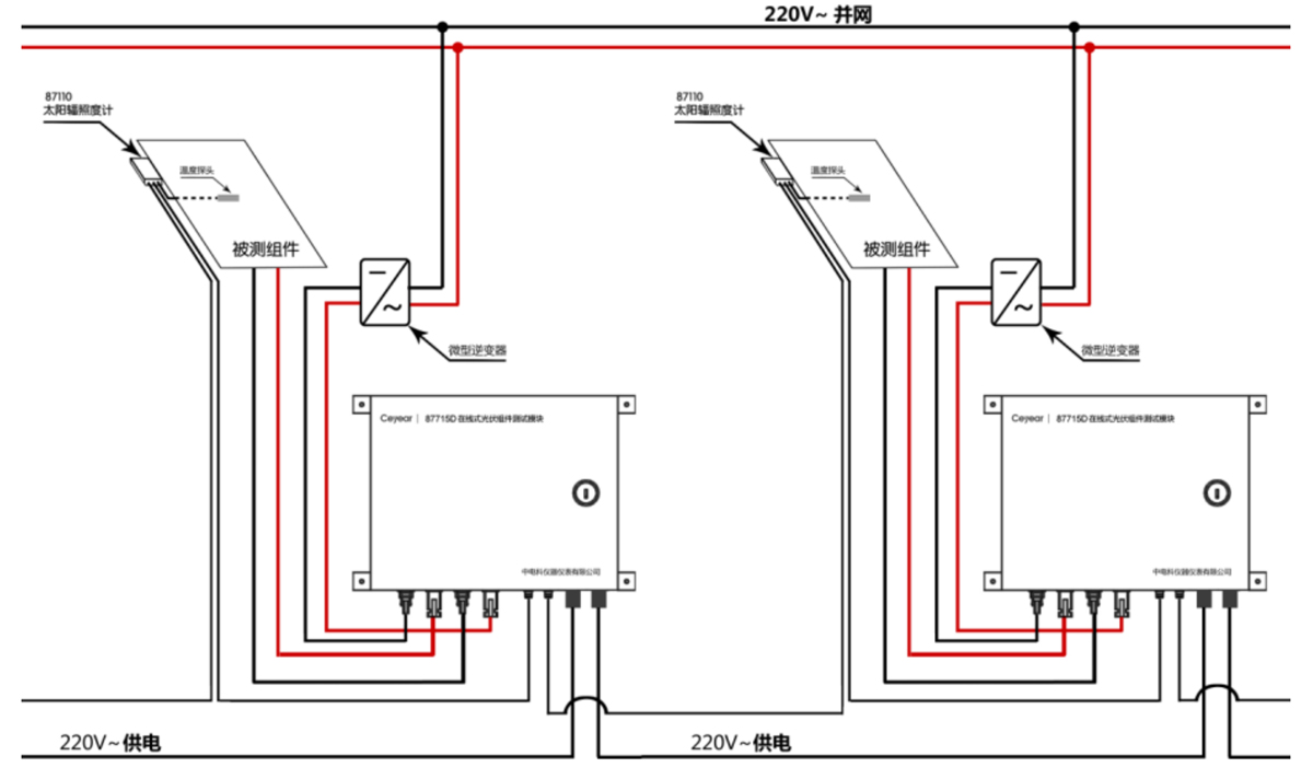 - 支持87110B太陽輻照度計一同組網(wǎng),實現(xiàn)對被測組件輻照度、溫度的監(jiān)測。