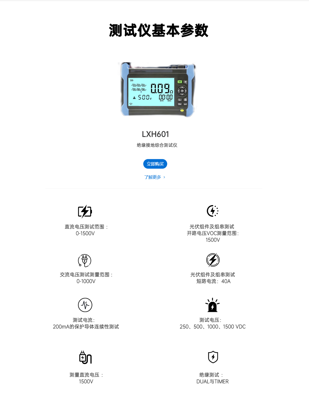 LX-H601絕緣電阻綜合測(cè)試儀應(yīng)用于光伏電站系統(tǒng)的電氣安全測(cè)試與高壓電力設(shè)備的絕緣測(cè)試,整機(jī)涵蓋電壓電流測(cè)試、連續(xù)性接地測(cè)試、極性測(cè)試、Voc、Lsc、絕緣測(cè)試、絕緣故障定位、接地測(cè)試等。